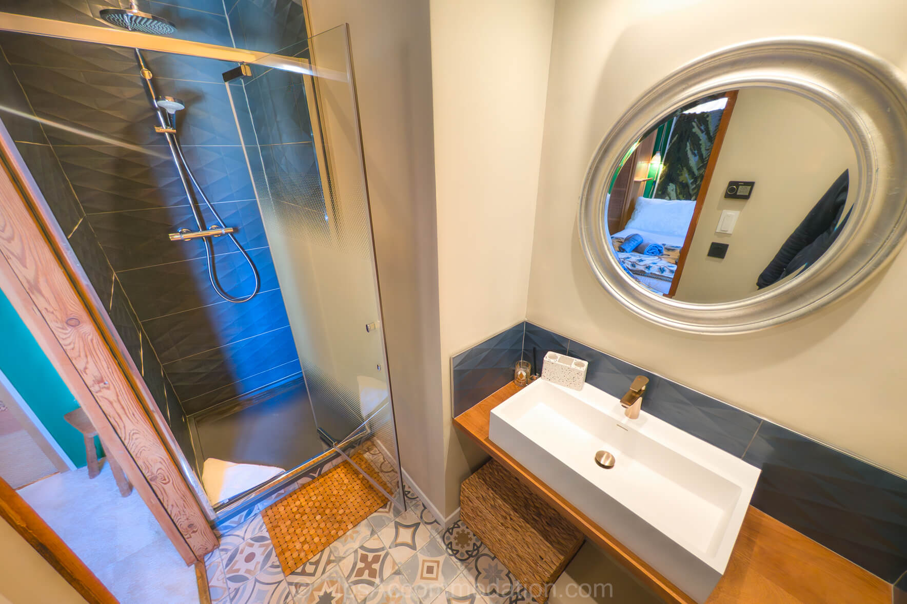 Bedroom 1 is a wonderfully spacious 15 m² ensuite room featuring a super king-size bed (which can be arranged as twins on request). An east-facing private balcony looks out over the historic streets of Samoëns, with the dramatic Criou mountain rising above. A wardrobe and chest of drawers provide generous storage, while the ensuite bathroom includes a bath with shower, washbasin and WC. A second entrance allows this bathroom to be shared with Bedroom 5 if required.