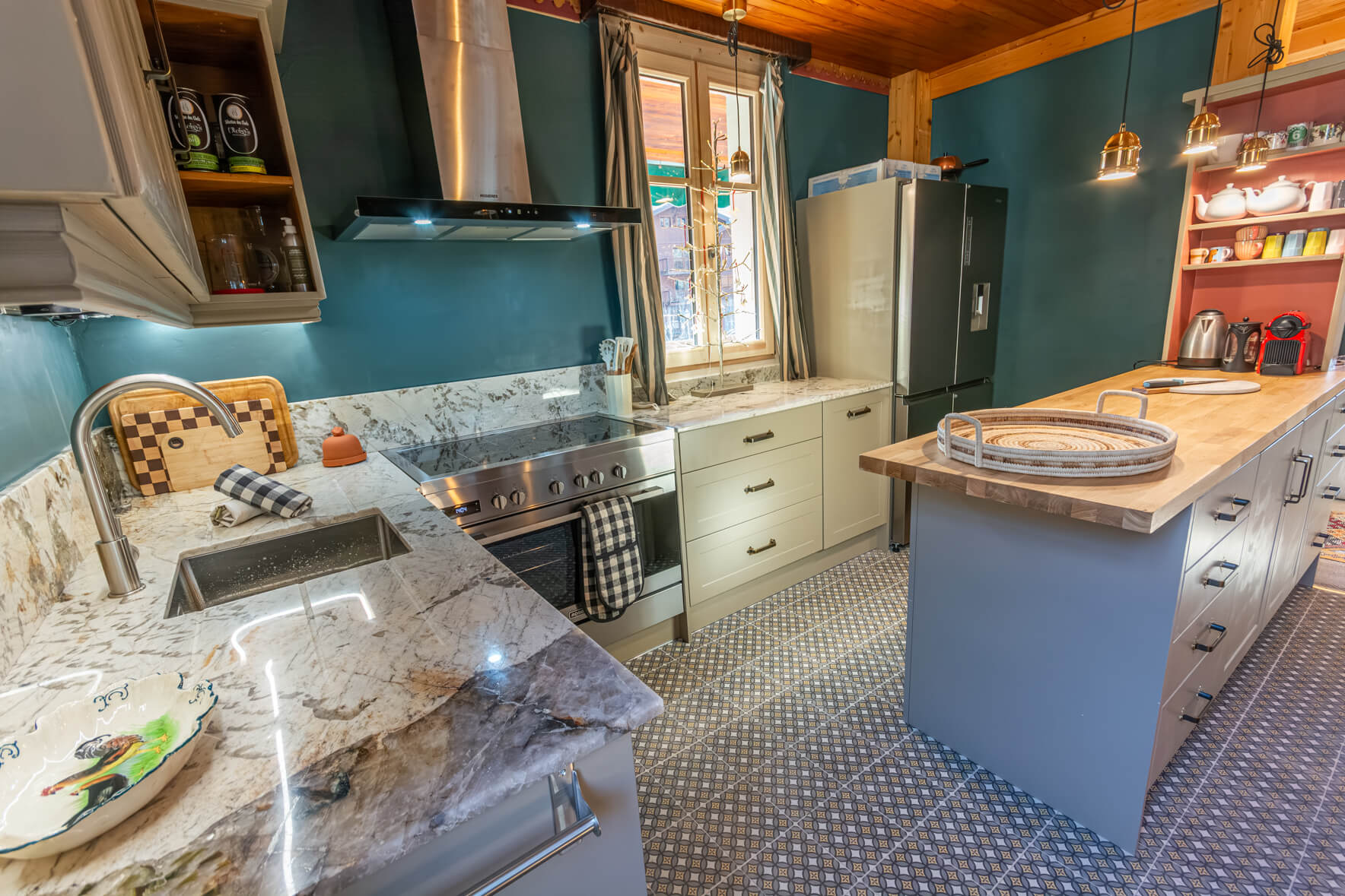 The high-quality kitchen is as stylish as it is well-equipped, featuring a striking granite worktop, a five-ring range cooker, a large American-style fridge-freezer and a Nespresso coffee machine - perfect for relaxed breakfasts or cooking for a larger group.